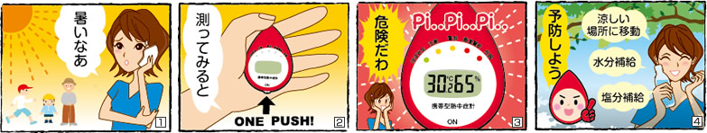 暑い時は熱中症計、寒い時は風邪指標計にボタン一つで切り替えることが可能で、一年を通して使えます。手動での計測と見守り機能をONにしておけば、10分おきに自動計測をします。